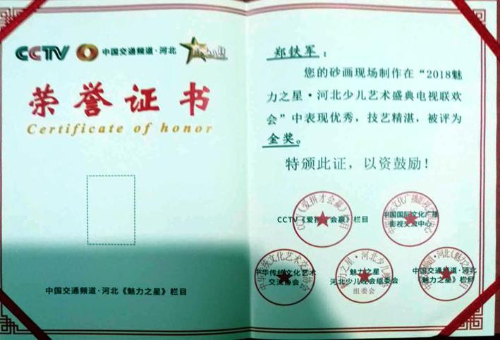 鄭氏砂畫制作榮獲“2018魅力之星河北少兒藝術盛典電視聯歡會”金獎,同時鄭氏砂藝文化有限公司被授予中國交通頻道·河北魅力之星“藝術教育培訓基地”。