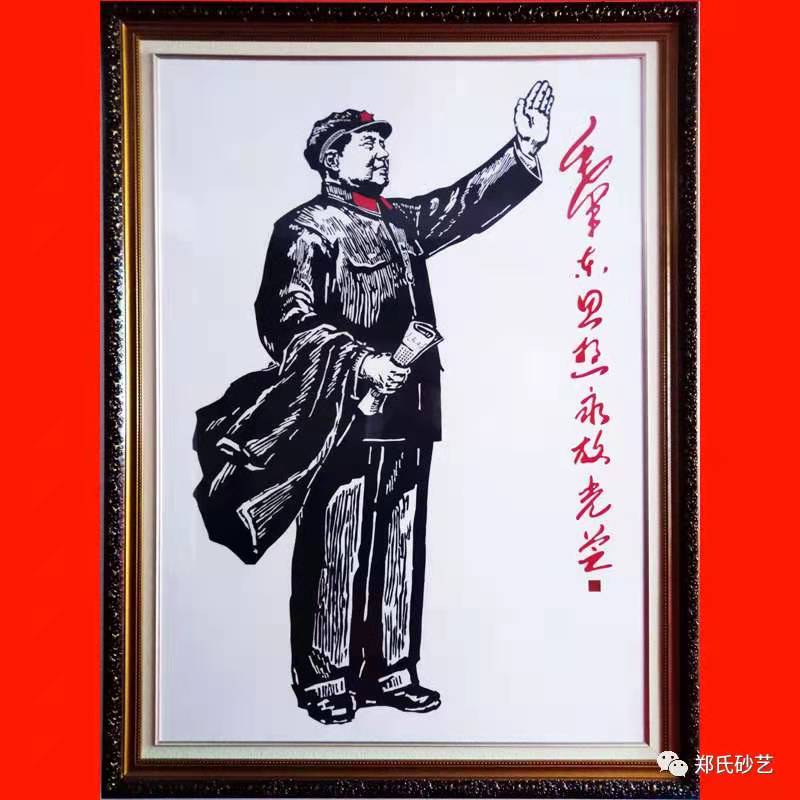 鄭氏砂藝(畫)使用材質(zhì)獨特新奇,以天然彩砂和金銀絲為主要材料,經(jīng)過繪(選)圖、走膠、掐絲、壓砂、裝裱五個純手工制作工藝步驟制成,作出的畫面精煉細膩,氣韻生動,彰顯出了毛主席胸懷天下的國家領導人氣質(zhì),展出效果良好,得到了參觀人員的一致好評。