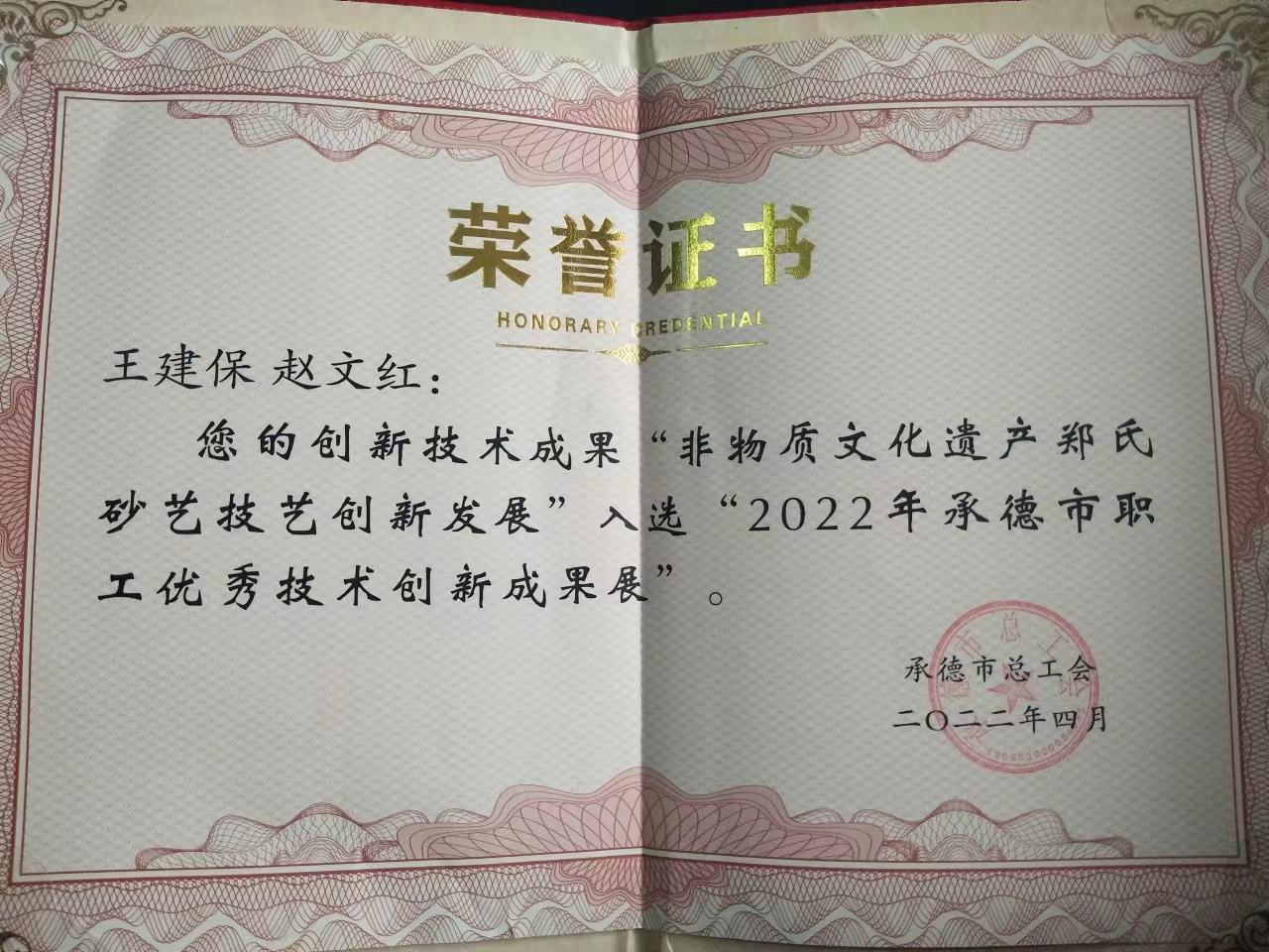 近年來鄭氏砂藝以創(chuàng)新發(fā)展為根本,不斷加大創(chuàng)新研發(fā)投入,引進(jìn)人才技術(shù),聘請原清華大學(xué)文化與旅游產(chǎn)品設(shè)計研發(fā)中心總監(jiān)尹建民教授為鄭氏砂藝技術(shù)顧問,創(chuàng)新研發(fā)出多種旅游紀(jì)念品,并提升改進(jìn)砂畫制作工藝,使“非遺”砂畫技術(shù)和質(zhì)量不斷提高,期間研發(fā)的9項實用新型專利被國家知識產(chǎn)權(quán)局認(rèn)定,新產(chǎn)品多次參加國家、省、市地區(qū)舉辦的文化產(chǎn)業(yè)博覽會,并榮獲“中國十大最具文化創(chuàng)意旅游紀(jì)念品”、“最具創(chuàng)意的工藝品”、“河北省十佳旅游紀(jì)念品”和“承德珍品”等百余項榮譽(yù),倍受中外廣大客戶青睞。企業(yè)先后榮獲“河北省科普示范基地”、“河北省文化產(chǎn)業(yè)示范基地”、“河北省科技型中小企業(yè)”、“河北省誠信企業(yè)”、“河北省巧手脫貧示范基地”、“中國低碳綠色創(chuàng)新企業(yè)”和“河北省非遺扶貧就業(yè)工坊”等眾多稱號。目前,產(chǎn)品已成功走向美國、英國、法國、德國、俄羅斯、東南亞等多個國家和地區(qū)。