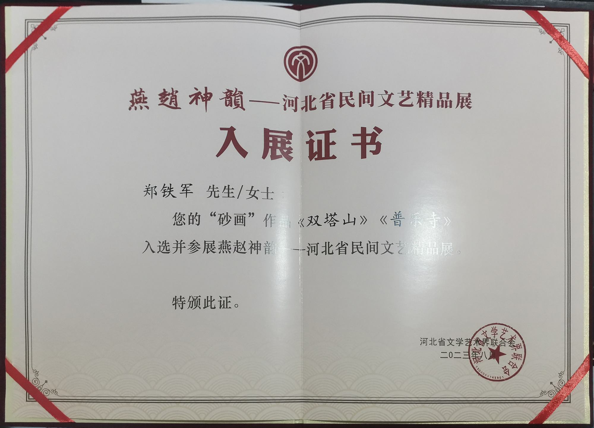 “雙爭”有我進行時,鄭氏砂藝(畫)亮相燕趙、再添光彩。2023年伊始,由省委宣傳部、省文聯(lián)主辦的“燕趙神韻”河北省民間文藝精品展在河北省拉開帷幕,鄭氏砂藝以承德避暑山莊景色為主題,創(chuàng)作并報送了砂畫作品《雙塔山》《普樂寺》。7月,鄭氏砂藝報送的作品經(jīng)過層層選拔入展了“燕趙神韻”河北省民間文藝精品展。