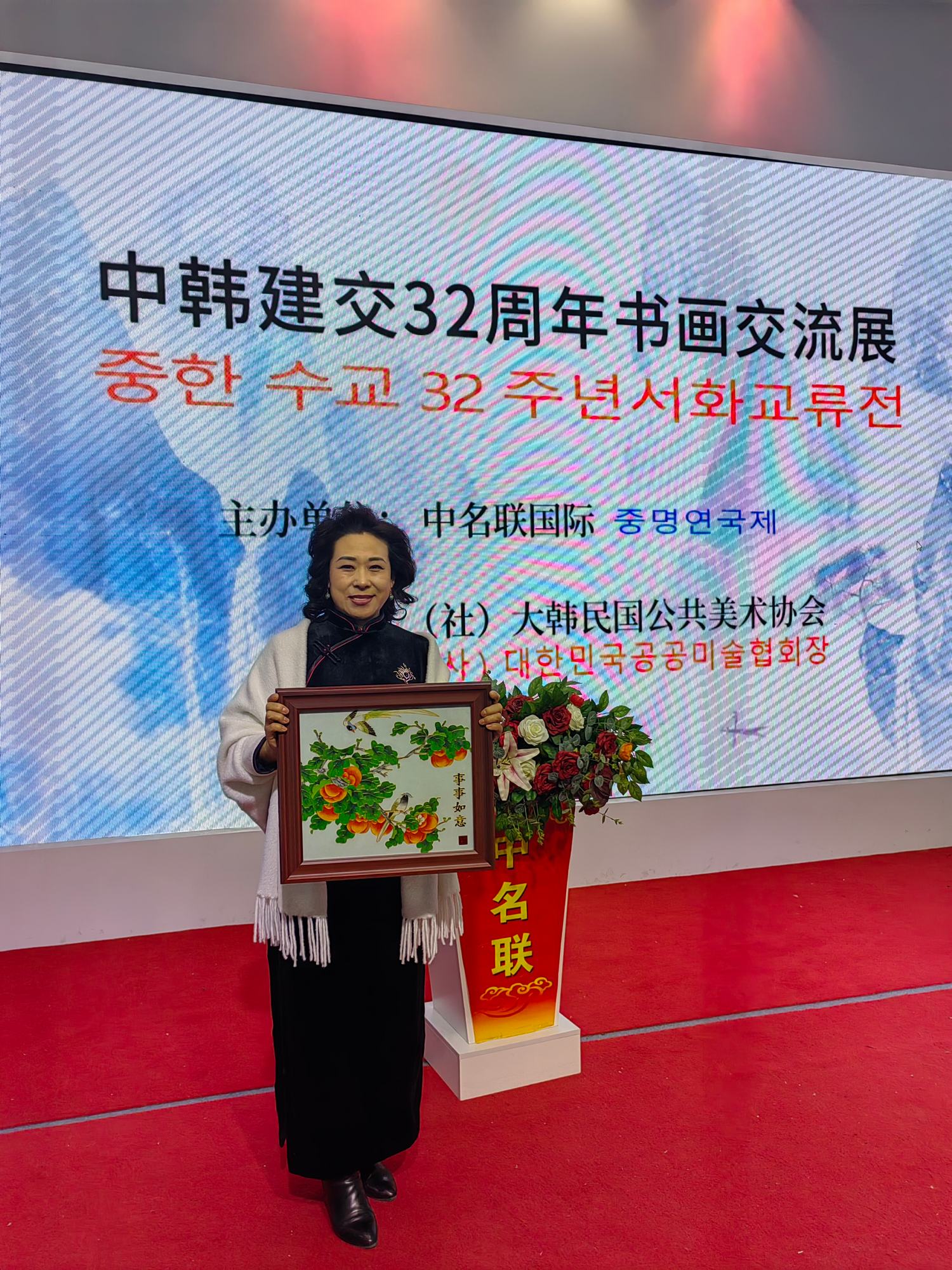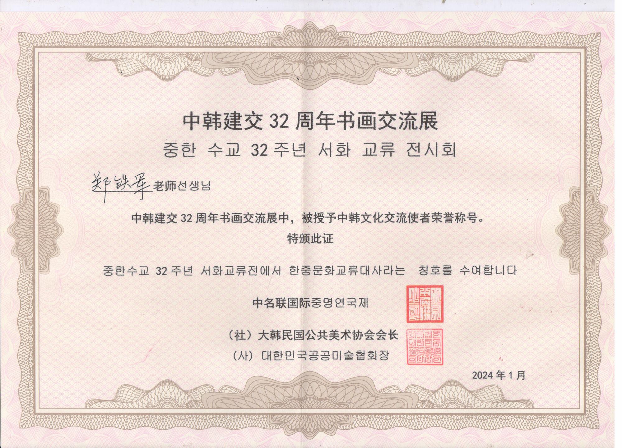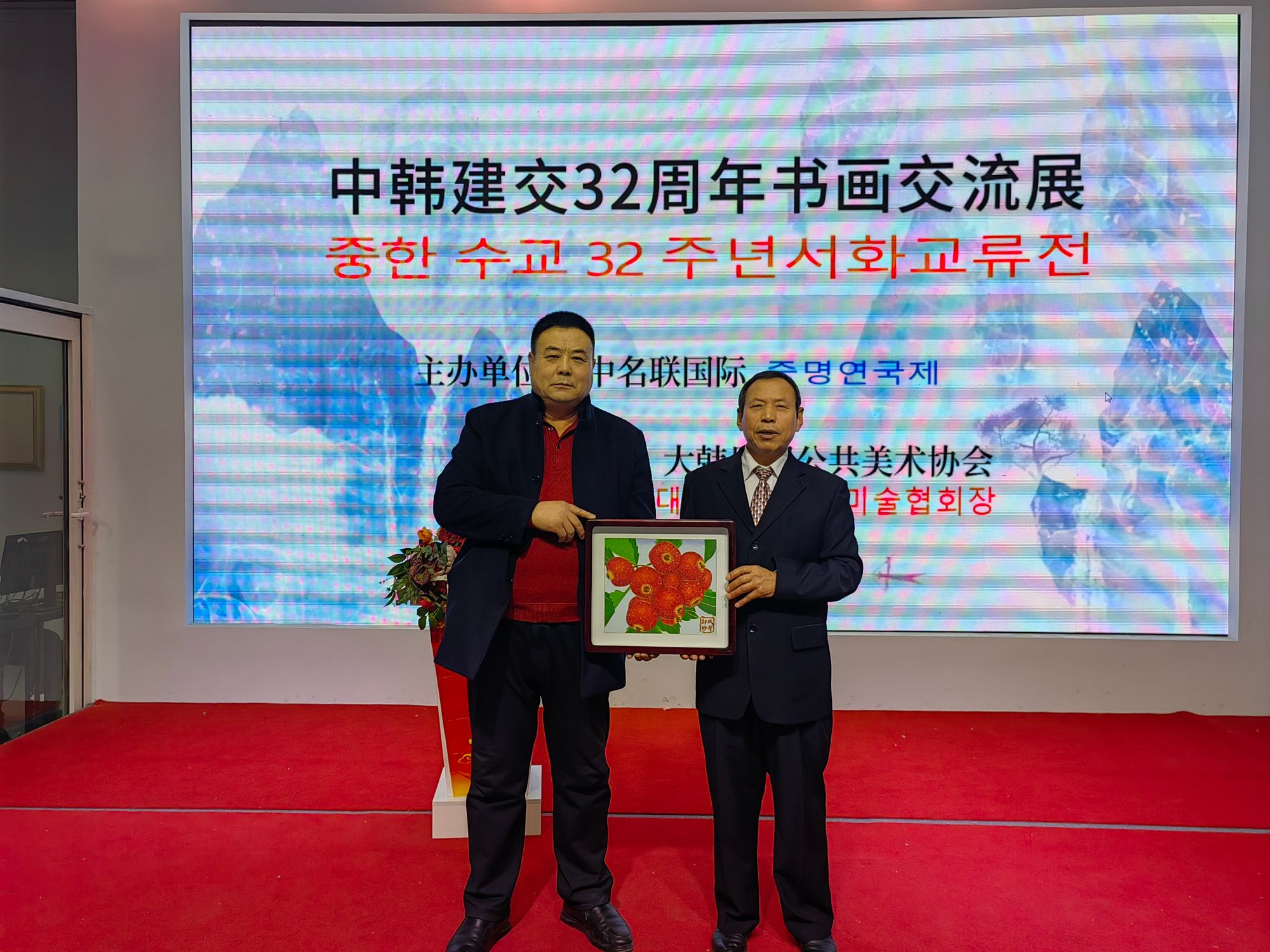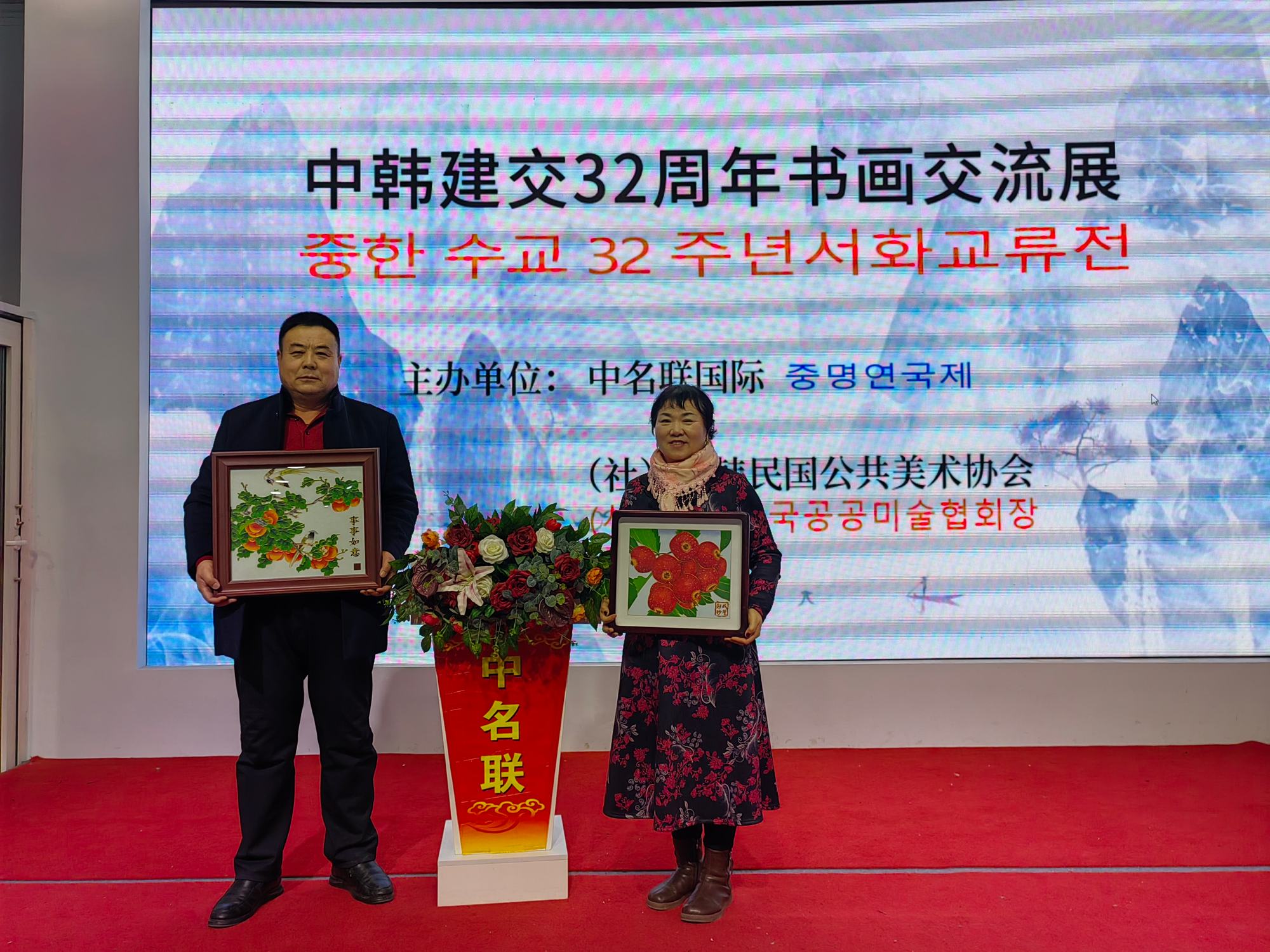 2024年1月28日,中韓建交32周年中韓藝術交流展在北京中名聯(lián)國際展廳隆重召開,活動由中名聯(lián)國際和大韓民國公共美術協(xié)會共同主辦,主要目的是加深中韓藝術家們的友誼和文化交流,加強中韓兩國人民友誼。鄭氏砂藝第五代非遺傳承人、中名聯(lián)簽約國禮藝術家鄭鐵軍先生應邀出席了此次活動,其鄭氏砂藝(畫)被大韓民國公共美術協(xié)會永久收藏,并授予鄭鐵軍“中韓文化交流使者”榮譽稱號。同時,韓方表示屆時將邀請中名聯(lián)簽約國禮藝術家赴韓國國會展覽,搭建中韓深化文化藝術交流橋梁。