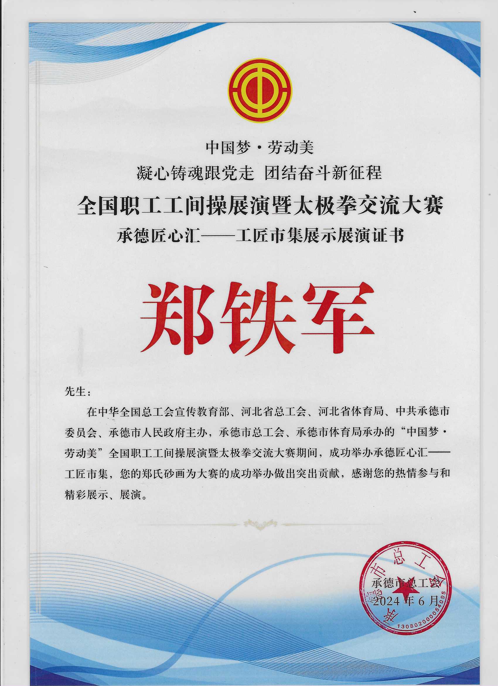 2024年6月4日,由全國(guó)總工會(huì)宣傳教育部、河北省總工會(huì)、河北省體育局、承德市委市政府聯(lián)合舉辦的“中國(guó)夢(mèng)·勞動(dòng)美——凝心鑄魂跟黨走 團(tuán)結(jié)奮斗新征程”全國(guó)職工工間操展演暨太極拳交流大賽活動(dòng)在承德市奧體中心開(kāi)幕。本次大賽為期三天,包括工間操展演大賽、太極拳交流大賽、健步走大賽,共有來(lái)自各省、自治區(qū)、直轄市,各全國(guó)產(chǎn)業(yè)工會(huì)、中央和國(guó)家機(jī)關(guān)工會(huì)聯(lián)合會(huì)的36支參賽隊(duì)600余名職工參賽。