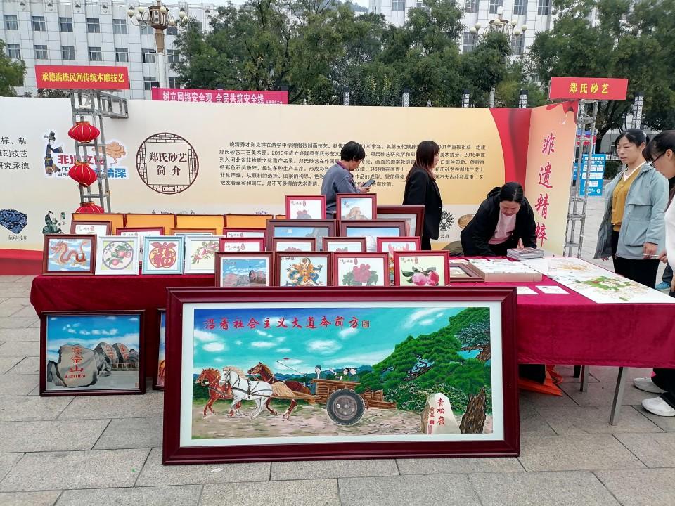 在展覽現(xiàn)場,鄭氏砂藝展區(qū)人頭攢動,熱鬧非凡。一系列精心創(chuàng)作的砂藝藝術(shù)品,如《國泰民安》《沿著社會主義大道奔前方》《興隆山》《霧靈山》《天文臺》及《紅紅火火》等,吸引了眾多觀眾的目光。這些作品不僅展現(xiàn)了鄭氏砂藝精湛的制作工藝和獨特的藝術(shù)風格,更蘊含了對祖國繁榮昌盛、人民幸福安康的美好祝愿。鄭氏砂藝的展品憑借其獨特的藝術(shù)魅力和深刻的主題內(nèi)涵,贏得了廣大父老鄉(xiāng)親的喜愛和贊賞。觀眾們紛紛駐足觀賞,拍照留念,更有不少人表示被這些作品深深打動,感受到了濃厚的愛國情懷和藝術(shù)氛圍。