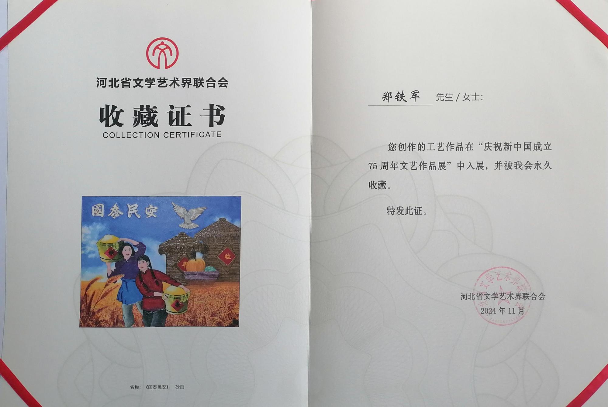 近期,在河北省文學藝術界聯合會舉辦的“慶祝新中國成立75周年文藝創作展”中,由鄭鐵軍創作的《國泰民安》憑借其獨特的藝術魅力和深厚的文化底蘊,被河北省文學藝術界聯合會永久收藏,成為本次展覽的一大亮點。