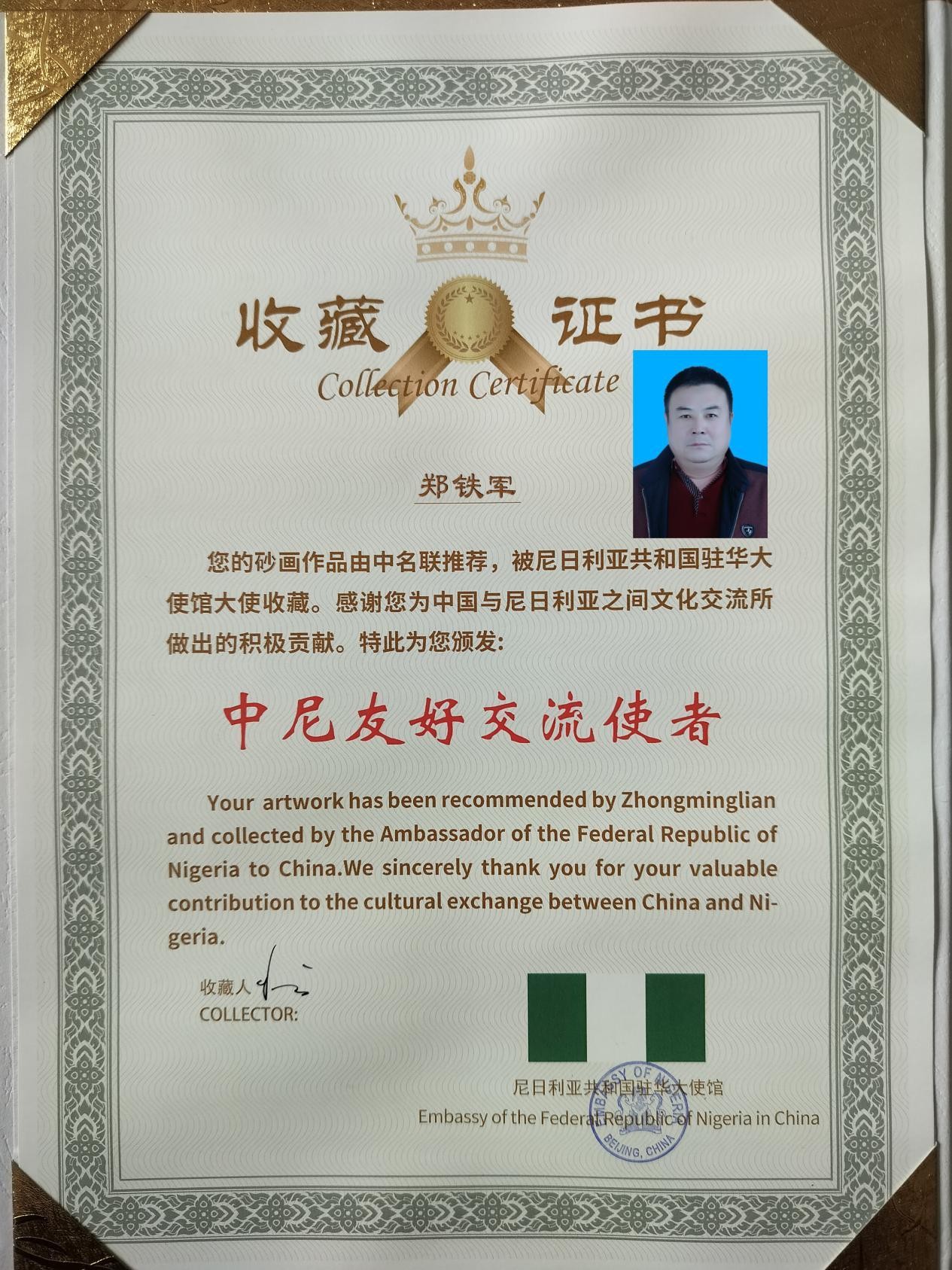 鄭鐵軍老師介紹道:“鄭氏砂藝起源于晚清秀才鄭克祥,歷經(jīng)百年時光沉淀與五代匠人的薪火相傳,于21世紀(jì)初成功躋身省級非物質(zhì)文化遺產(chǎn)名錄。該砂藝原料采自燕山腳下的彩色礦山,經(jīng)精細(xì)研磨后,再經(jīng)設(shè)計、制圖、掐絲、點(diǎn)藍(lán)、封裝等多道工序悉心雕琢,每件作品都承載著燕趙大地深厚的文化基因。此次收藏的砂藝作品《平安》更是寓意平安、吉祥與和諧,象征兩國發(fā)展蒸蒸日上。”尼日利亞駐華大使對這件砂藝作品贊不絕口,由衷贊嘆道:“這件作品讓我深切感受到中華文化的博大精深。”大使當(dāng)場宣布收藏這件作品,并簽字留念,同時表示:“鄭氏砂藝融合自然與人文,彰顯中國文化魅力;中尼文化交流搭建起相互了解的橋梁,期待更多非遺項(xiàng)目互鑒互融。我將把這件作品陳列在使館文化區(qū),以此見證中尼文化交流的深厚情誼。”