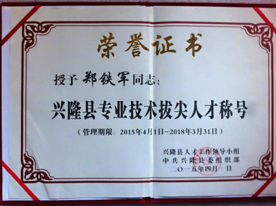 2015年4月1日,總經理鄭鐵軍被興隆縣人才工作領導小組、中共興隆縣委組織部授予“興隆縣專業技術拔尖人才”稱號。