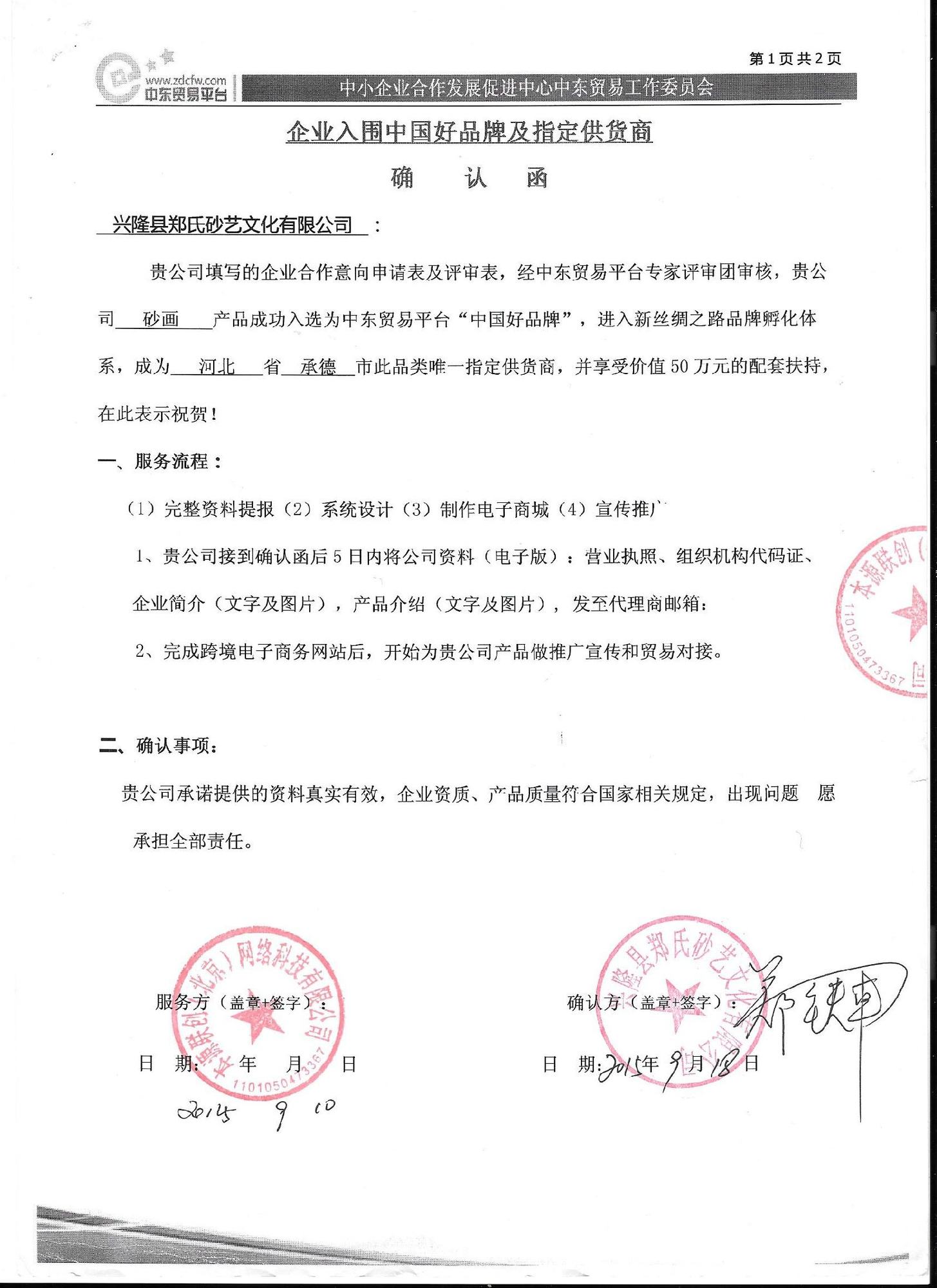 2015年9月10日,經中東貿易平臺專家評審團審核,本公司的砂畫產品成功入選為中東貿易平臺“中國好品牌”,進入新絲綢之路品牌孵化體系,成為河北省承德市此品類唯一指定供貨商,并享受價值50萬元的配套扶持。