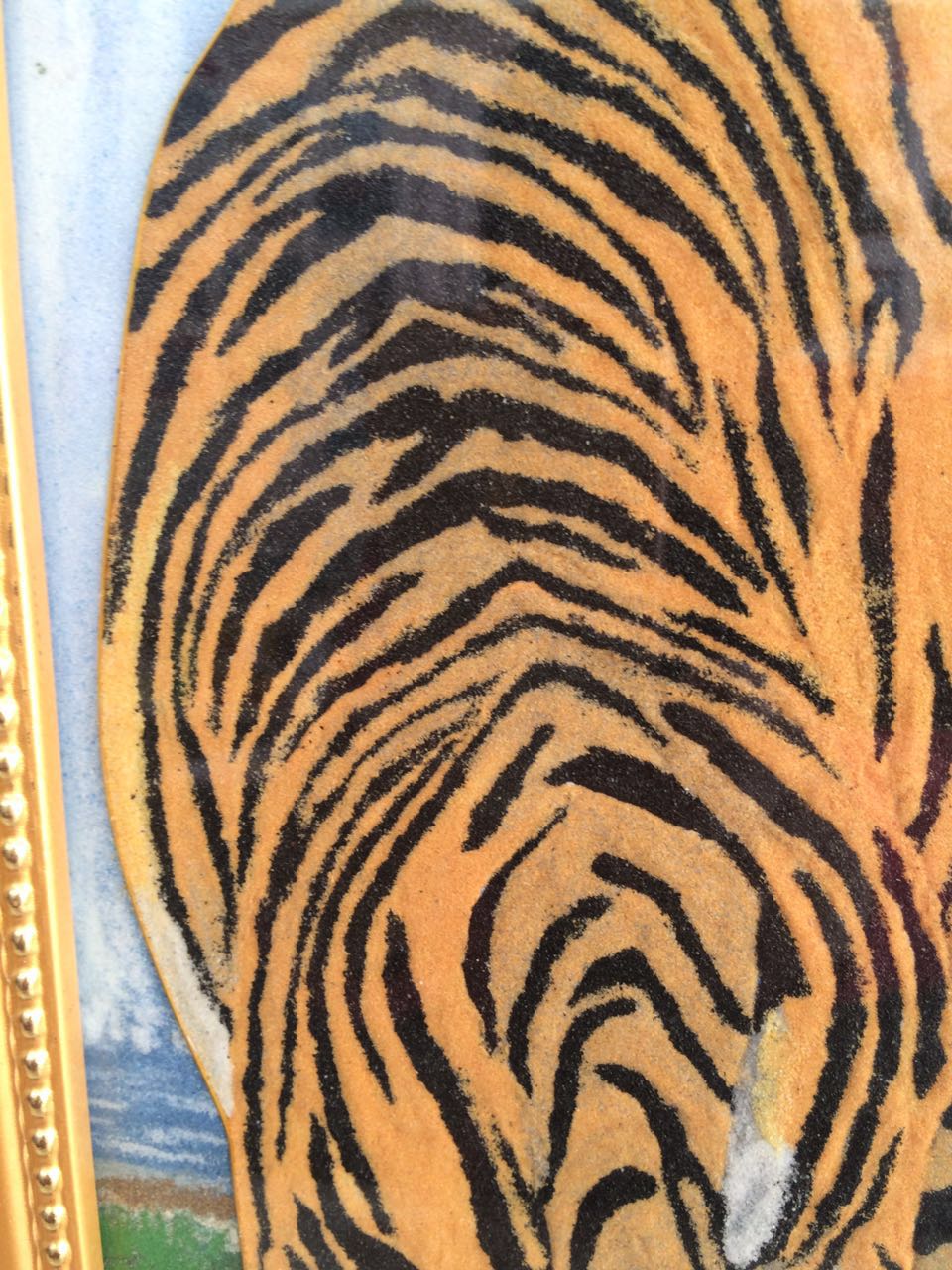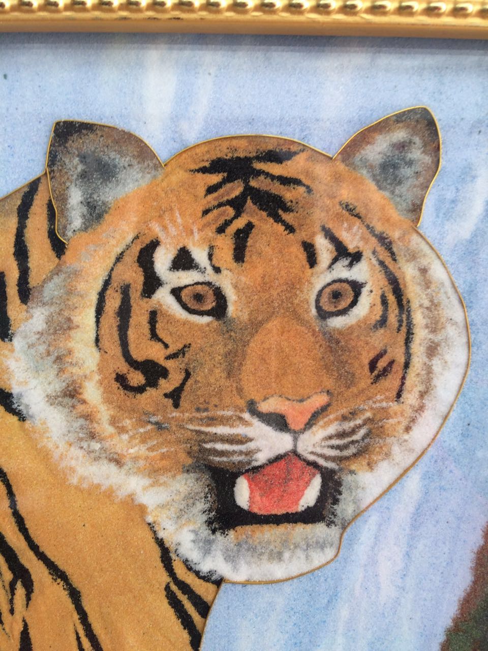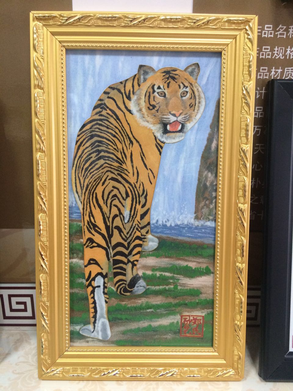 《老虎》28*58*3.5cm(長(zhǎng)*寬*高),該產(chǎn)品以老虎作為畫(huà)的主題, 老虎屬大型貓科動(dòng)物;毛色淺黃或棕黃色,滿有黑色橫紋;頭圓、耳短,耳背面黑色,中央有一白斑甚顯著;四肢健壯有力;尾粗長(zhǎng),具黑色環(huán)紋,尾端黑色。鄭氏金絲彩砂畫(huà)采用金銀絲與彩砂結(jié)合,填制出一只威猛的老虎。